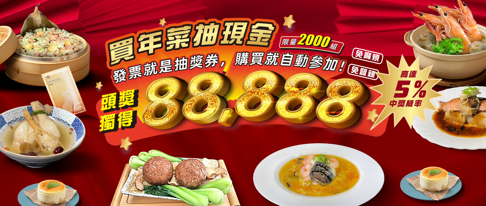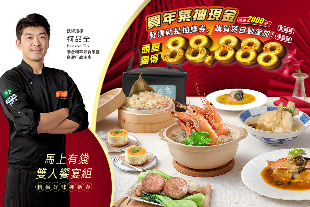 凡於活動期間內預購「馬上有錢雙人饗宴組」年菜,結帳開立之 發票號碼即自動具備抽獎資格。