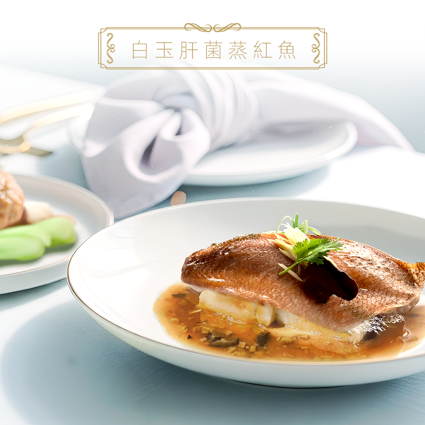 紅魚片佐牛肝菌清蒸紅魚,搭配蘿蔔糕吸收湯汁,極致鮮美。