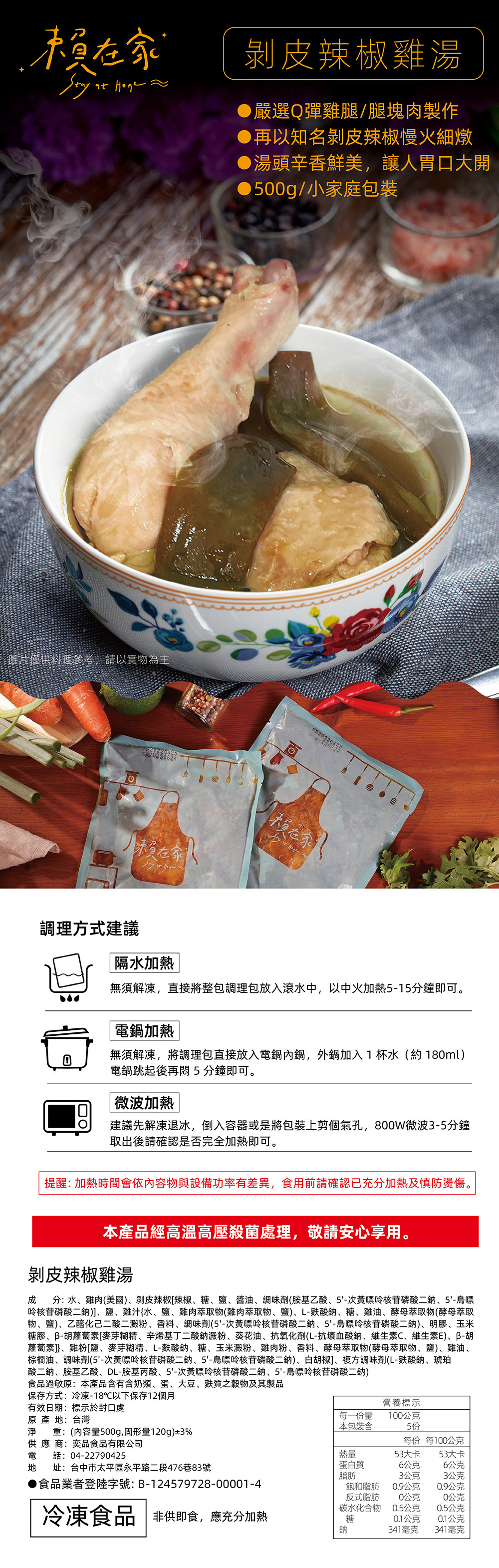 選用新鮮優質的雞肉與精心挑選的剝皮辣椒,以獨家秘製配方精心調製而成。雞肉鮮嫩多汁,辣椒香氣四溢,完美融合,口感豐富,風味獨特。無論是快速方便的午餐還是晚餐,這款調理包都能讓您輕鬆享受美味佳餚。只需簡單加熱,即可品嚐到餐廳級的美味。是忙碌日常中不可或缺的便捷選擇,讓您隨時隨地享受正宗的剝皮辣椒雞風味。