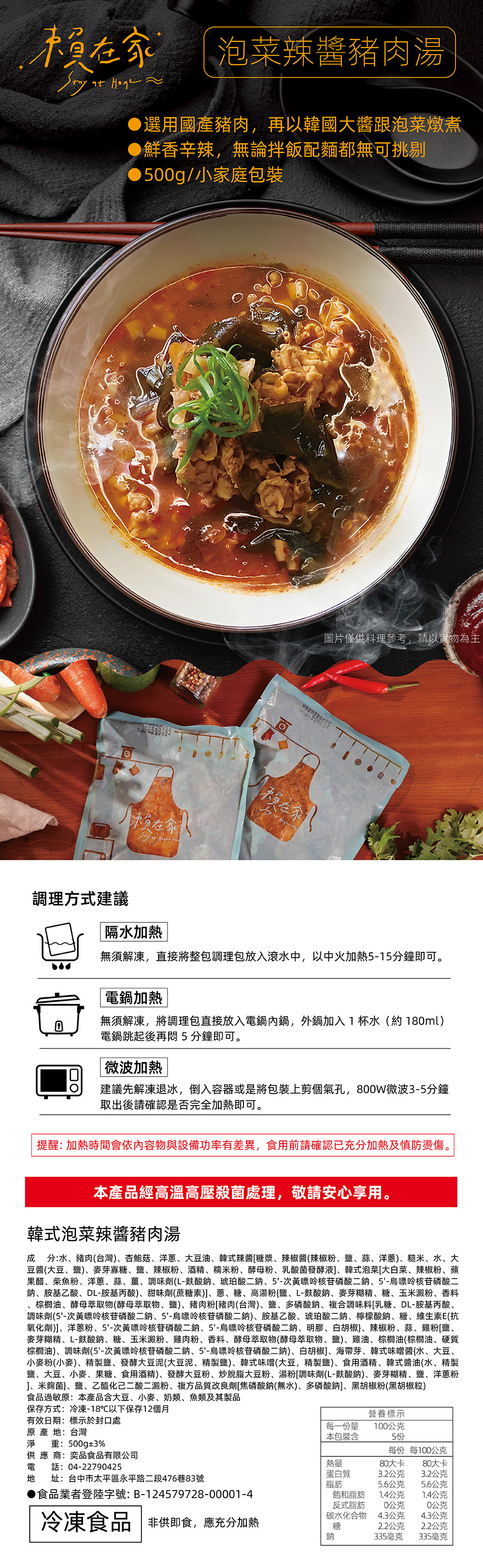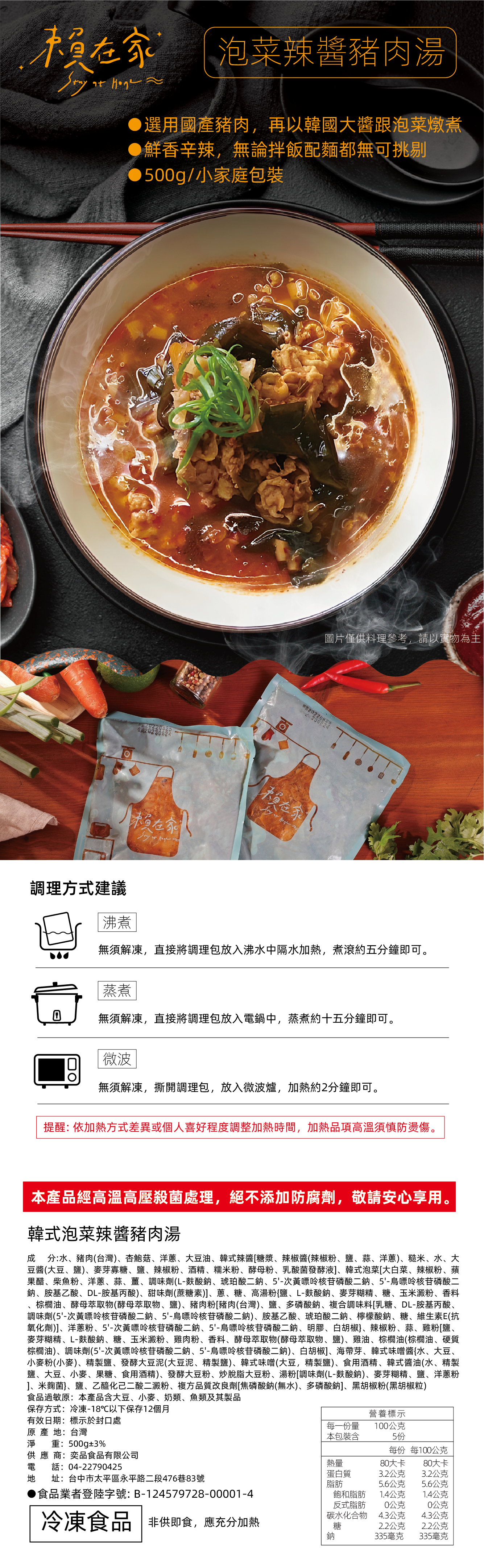 選用上等豬肉,搭配經典韓式泡菜與韓式大醬,精心熬製。湯頭香辛濃郁,豬肉與泡菜完美融合在湯頭裡面,無論配飯或是加麵,都是絕配,讓您暖心又暖胃的最好選擇。只需簡單加熱,即可品嚐到地道的韓式風味,是您忙碌時刻的美味佳選。無論是寒冷冬日還是想要刺激味蕾的時刻,這款調理包都能帶來溫暖與滿足。讓您在家中輕鬆享受正宗韓式泡菜辣醬豬肉湯的獨特美味,滿足您的韓式料理渴望。