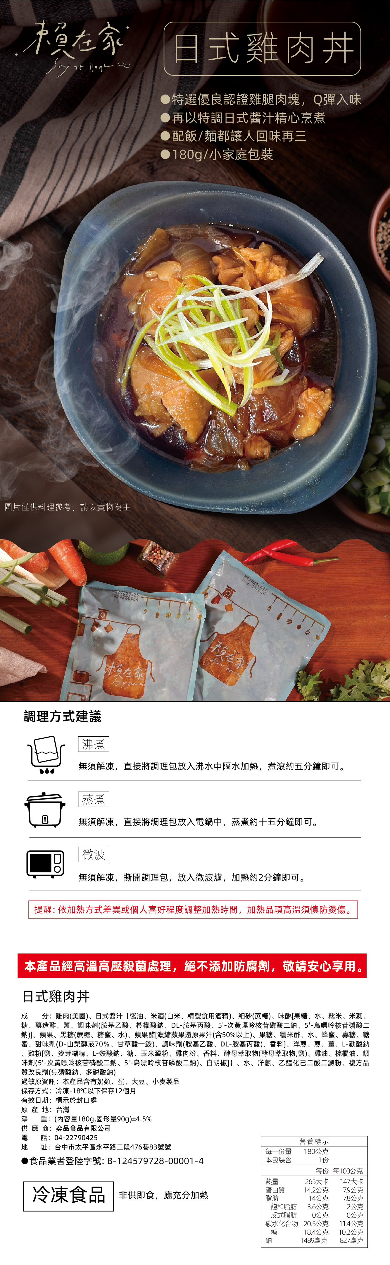 特選優良認證雞腿肉塊,加上獨家配方烹調,雞肉鮮嫩Q彈無腥味,與特調日式醬汁完美結合,成為讓人垂涎欲滴的雞肉丼。醬汁採用多種精選調味料熬製,風味濃郁,與雞肉的鮮嫩搭配,帶來豐富的味覺享受。無論是忙碌的午餐還是輕鬆的晚餐,簡單加熱一下,美味立即上桌。搭配熱騰騰的白飯,每一口都是滿滿的滿足感,是您不可錯過的一道美味
